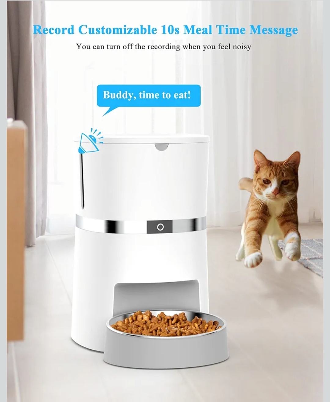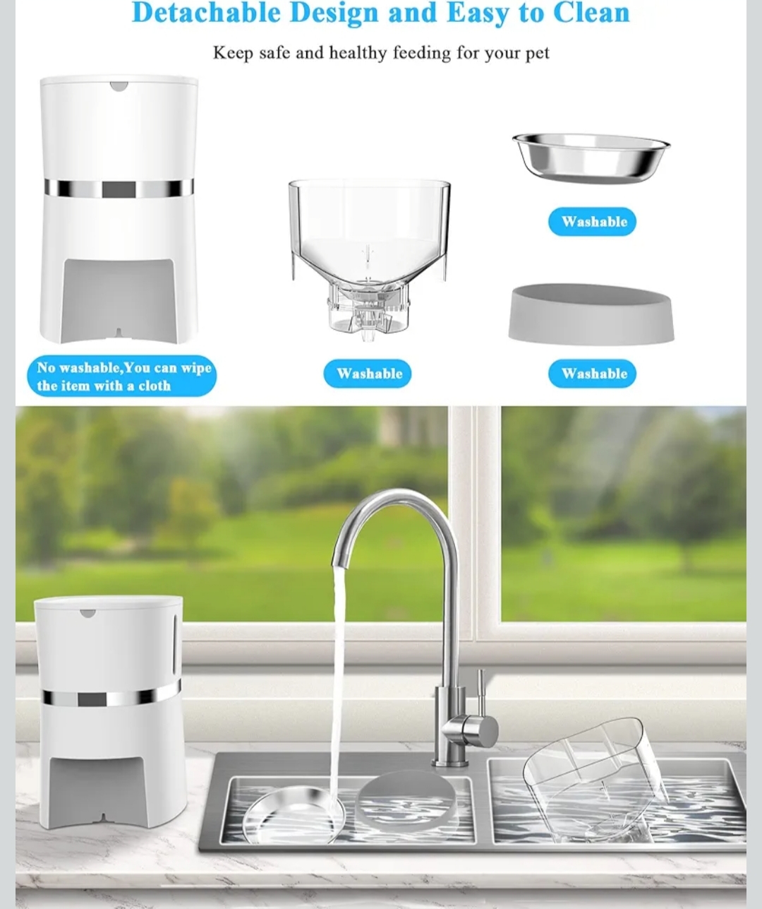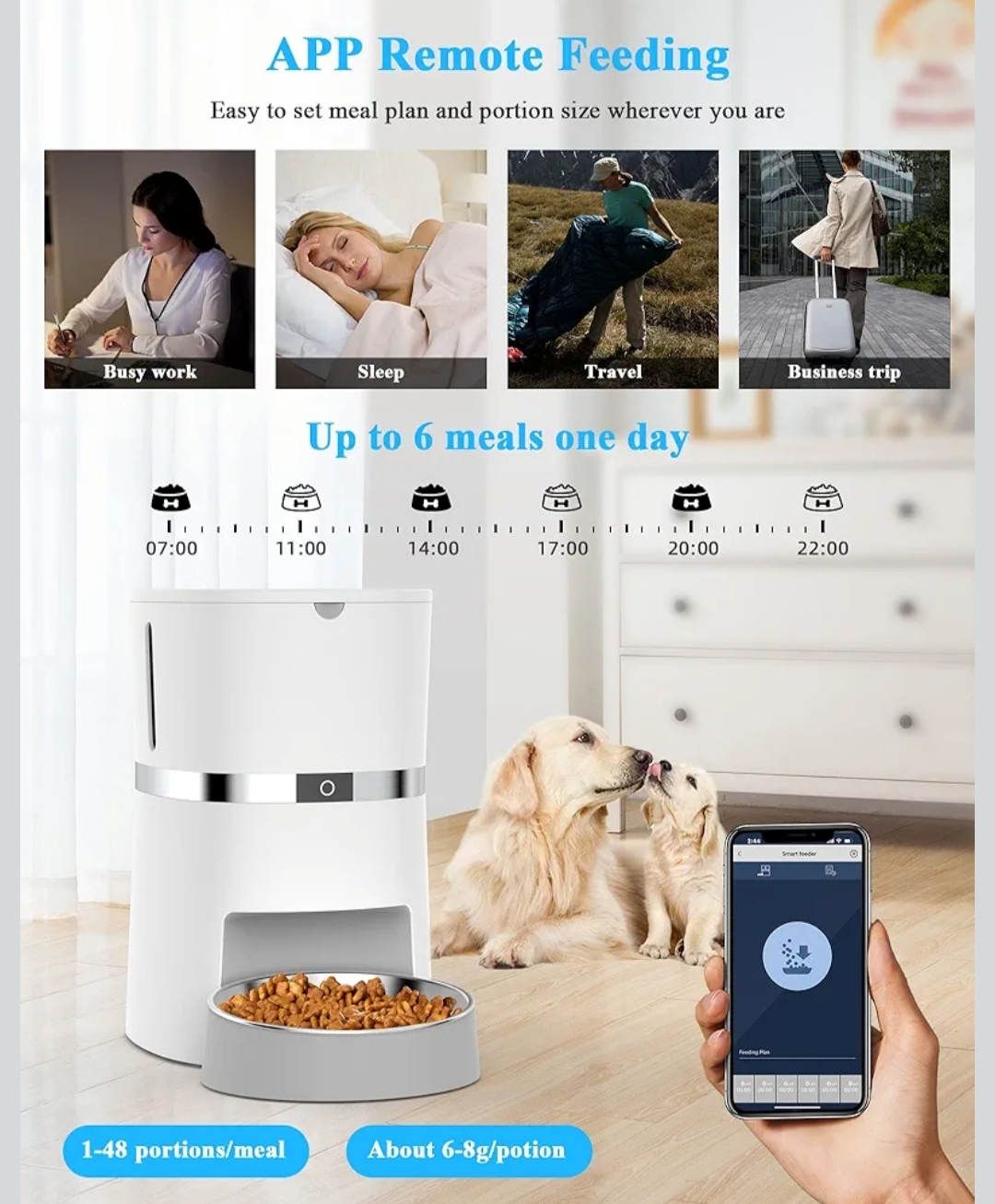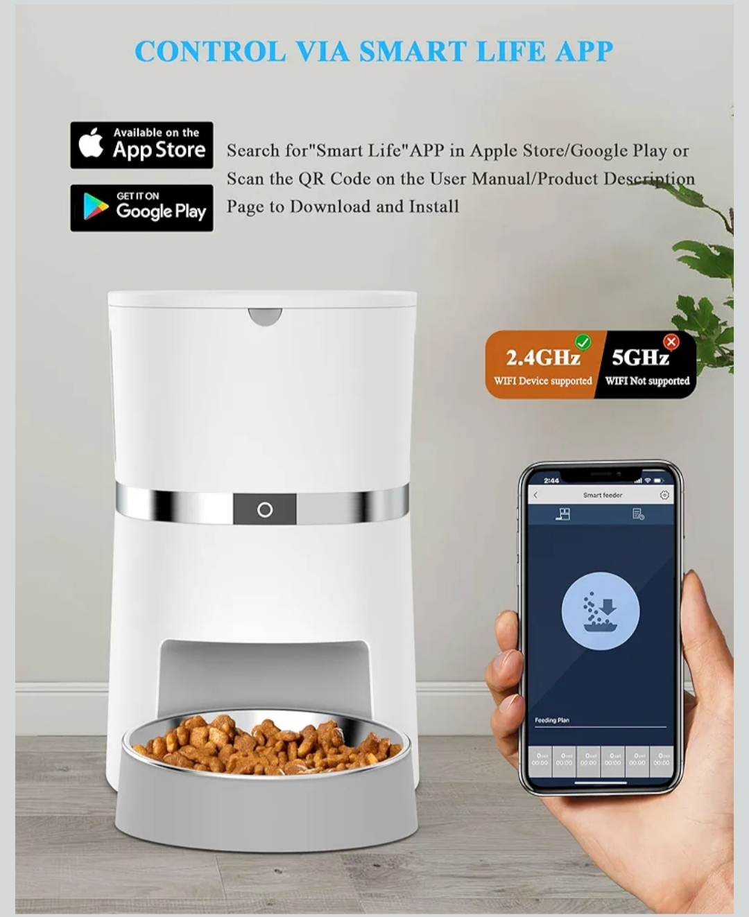 تغذیه از راه دور با اپلیکیشن】دیگر نیازی به تماسهای بیدارباش برای غذا خوردن یا نگرانی در روزهای پرمشغله نیست! ظرفیت ۴ لیتری میتواند نیازهای غذایی گربهها یا سگها را برای چند روز برآورده کند. میتوانید از طریق تلفن هوشمند خود، از راه دور، غذادهنده هوشمند گربه را کنترل کنید تا در هر زمان و هر مکان به حیوانات خانگی خود غذا دهید. غذادهنده گربه WellToBe Wifi از اپلیکیشن برای سیستمهای IOS و اندروید پشتیبانی میکند. این اپلیکیشن را میتوان با چندین حساب کاربری به اشتراک گذاشت که استفاده از آن برای اعضای خانواده بسیار راحت است. (فقط از شبکه ۲.۴ گیگاهرتز پشتیبانی میکند)