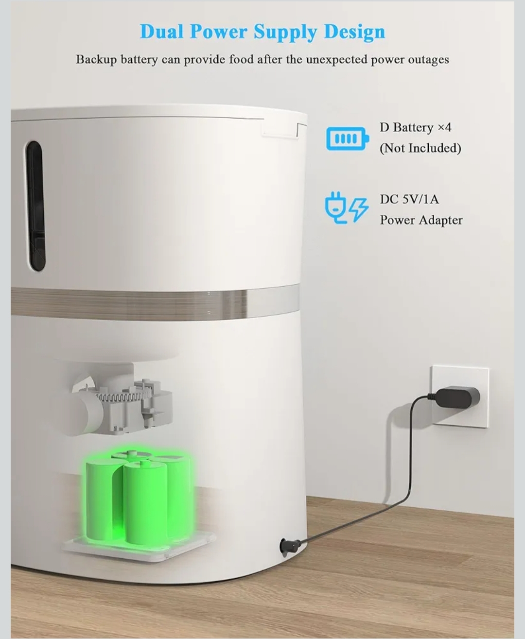 【منبع تغذیه دوگانه】 با آداپتور برق و باتریهای قلیایی ۴ ولتی تغذیه میشود. در صورت قطع برق، غذاساز با باتری به کار خود ادامه میدهد تا حیوان خانگی شما هرگز وعده غذایی را از دست ندهد (باتریها شامل نمیشوند). توصیه میشود در صورت قطع برق، از باتری و آداپتور هر دو استفاده کنید. حافظه تنظیم وعده غذایی برای جلوگیری از از دست رفتن برنامه غذایی هنگام قطع ناگهانی برق.